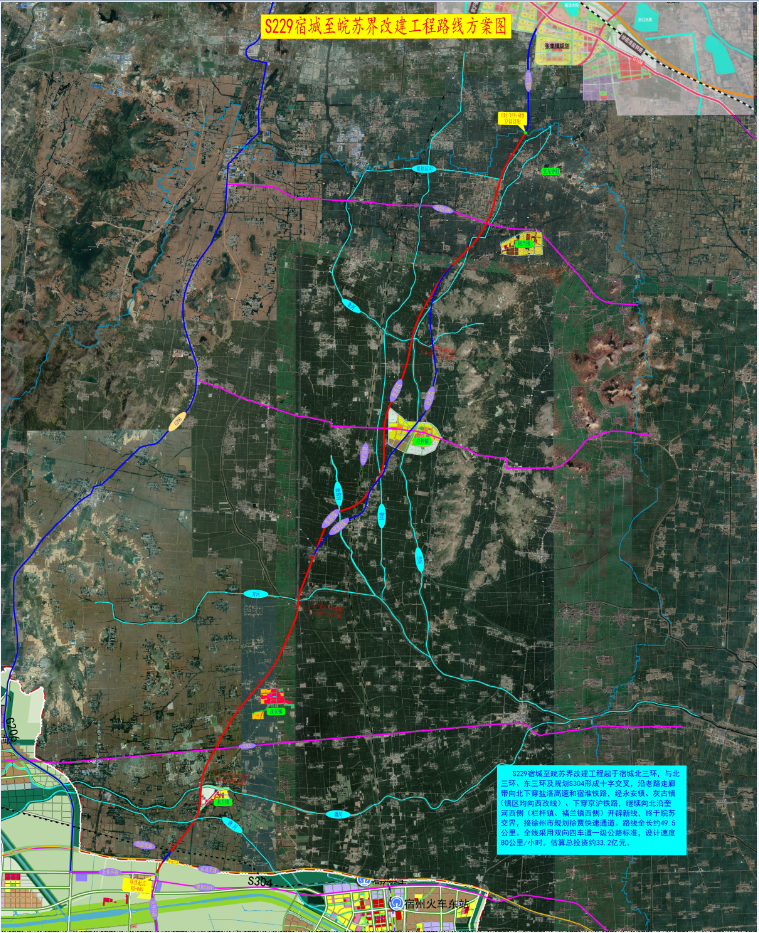 S229宿城至皖蘇界改建工程起于宿城北三環(huán),與北三環(huán)、東三環(huán)及S304形成十字交叉,沿老路走廊帶向北下穿泗許高速和宿淮鐵路,經(jīng)永安鎮(zhèn)、灰古鎮(zhèn)(鎮(zhèn)區(qū)均向西改線)、下穿京滬鐵路,繼續(xù)向北沿奎河西側(欄桿鎮(zhèn)、褚蘭鎮(zhèn)西側)開辟新線,終于皖蘇交界,接徐州市規(guī)劃徐賈快速通道。采取雙向四車道一級公路建設標準,路線全長約49.5公里。項目總投資約33.2億元,計劃2024年初開工,2025年底完工。
